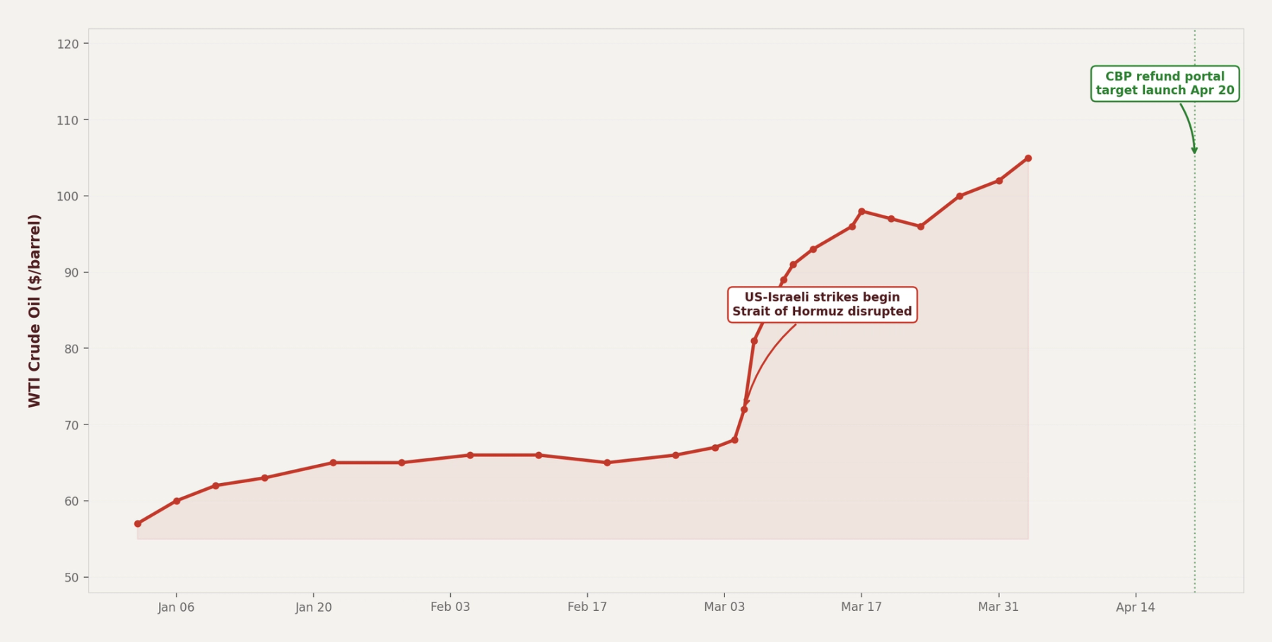 WTI crude oil nearly doubled in Q1 2026 while the tariff refund portal neared completion, creating two simultaneous forces that sort stocks into winners and losers