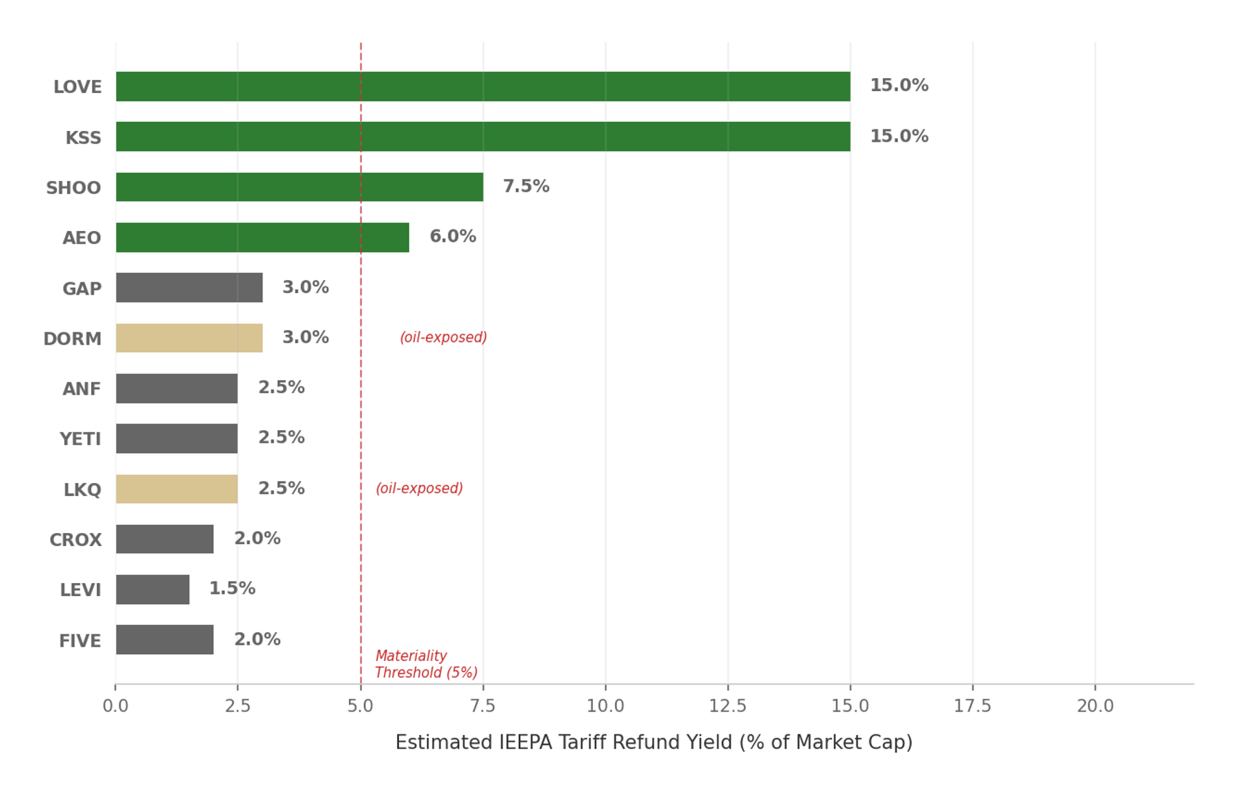 The analytical framework points to Steven Madden (SHOO) at 16.4x forward and American Eagle (AEO) at 12.4x forward as the highest-conviction double-tailwind names. Under these assumptions, IEEPA refund checks could represent roughly 5-10% of market cap, arriving into beaten-down valuations with near-zero oil exposure. The catalyst window opens April 20 when the CAPE portal accepts claims.