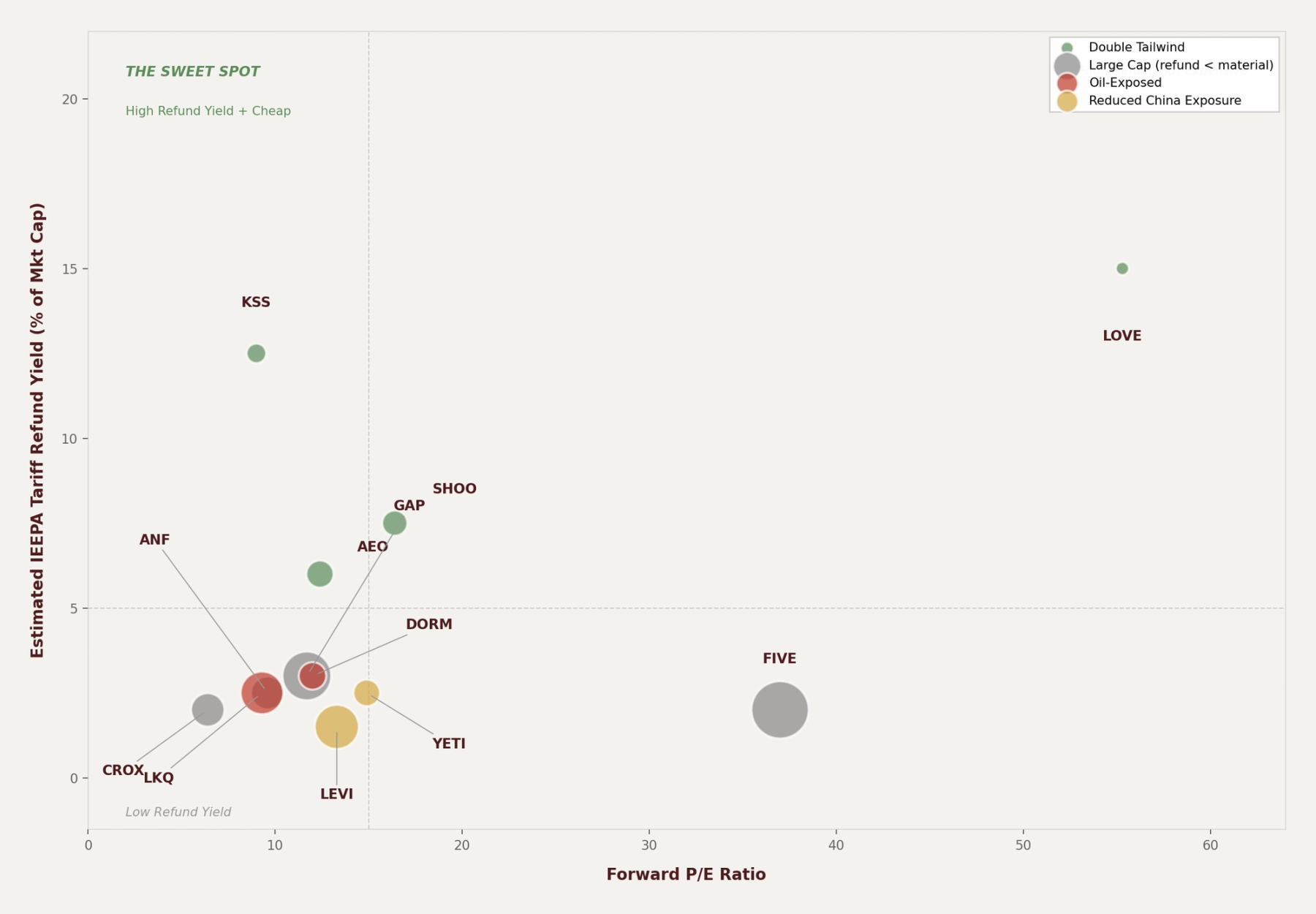 Source: ProCap Insights analysis. Forward P/E from FMP consensus estimates. Refund yield estimated from COGS, China sourcing percentages (per company filings and analyst reports), and IEEPA tariff rates. Market cap as of April 4, 2026. Bubble size proportional to market capitalization.