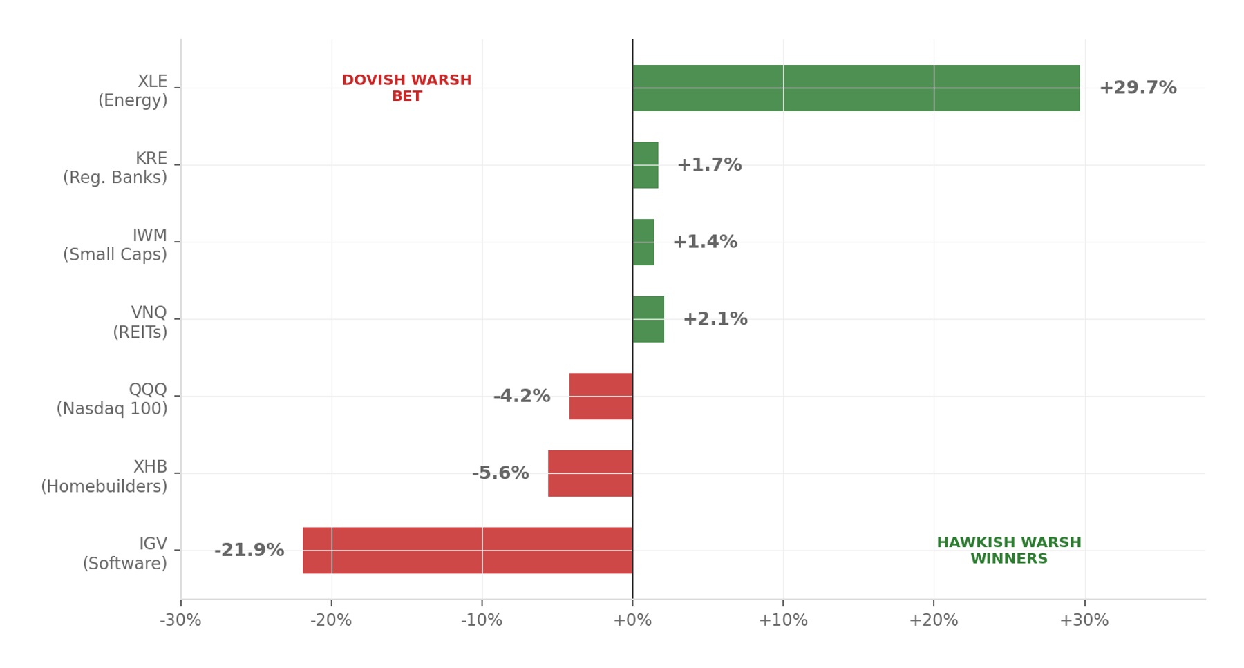 - The divergence trade is long XLE (+29.7% YTD) against short XHB (-5.6% YTD) and IGV (-21.9% YTD), reflecting a market that prices a hawkish Warsh in energy but a dovish Warsh in housing and software.