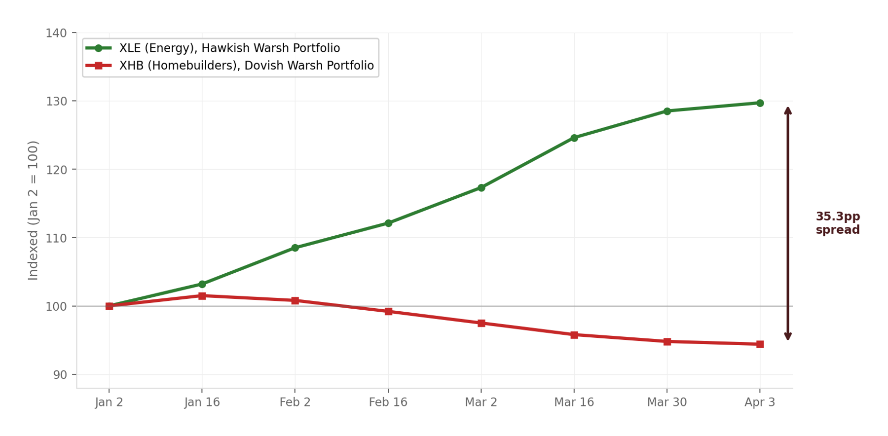 The "Dovish Warsh" portfolio and the "Hawkish Warsh" portfolio show among the widest performance spreads since the 2022 hiking cycle. Mapping which sectors win under each scenario reveals where the mispricing is most extreme.