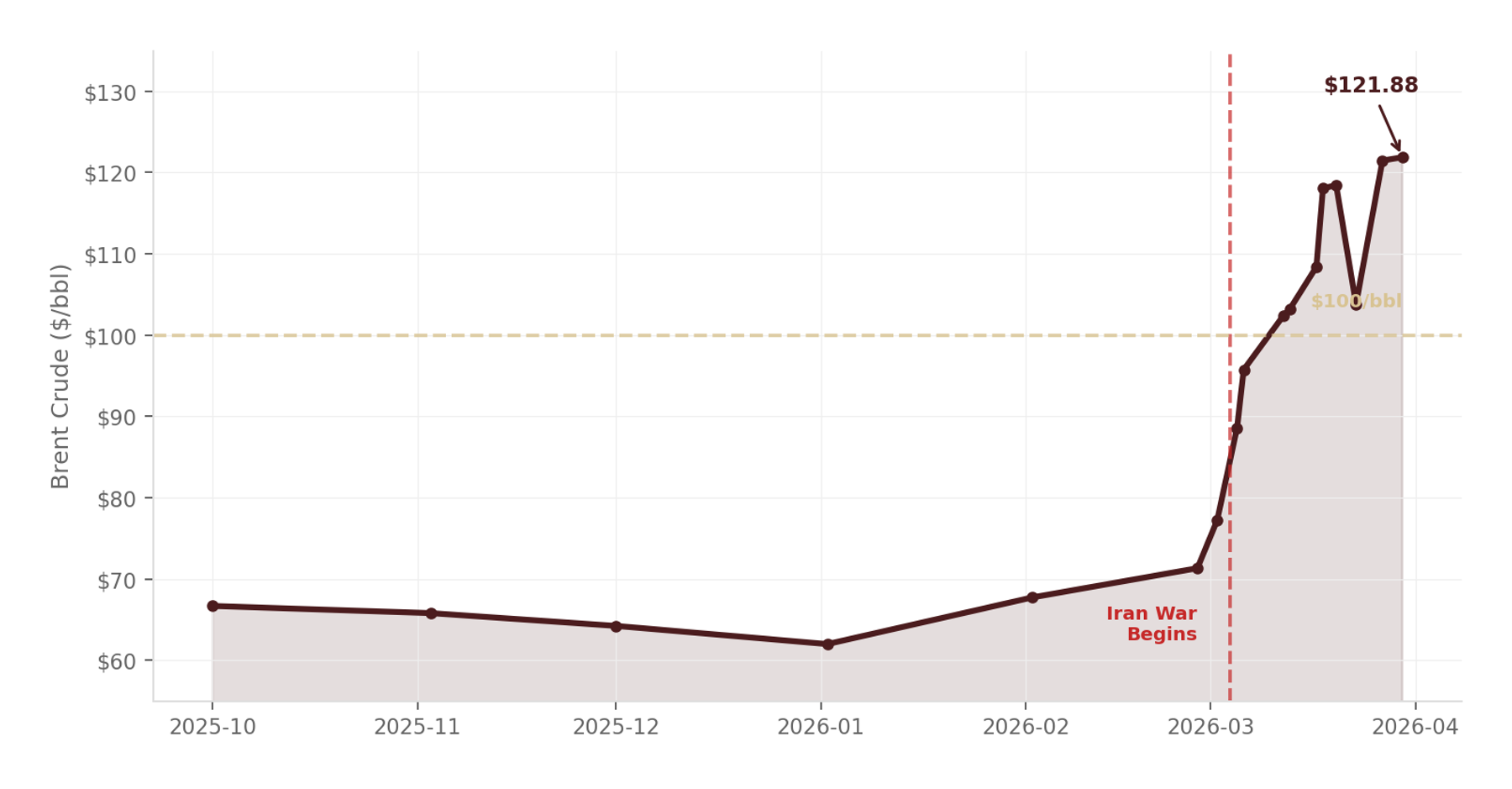 Brent closed at $121.88 on March 30, up 70.9% from $71.32 on February 27, after Iran closed the Strait of Hormuz on March 4.3 The International Energy Agency has characterized this as one of the largest supply disruptions in recent decades, disrupting flows that normally account for roughly 20% of global oil trade.4